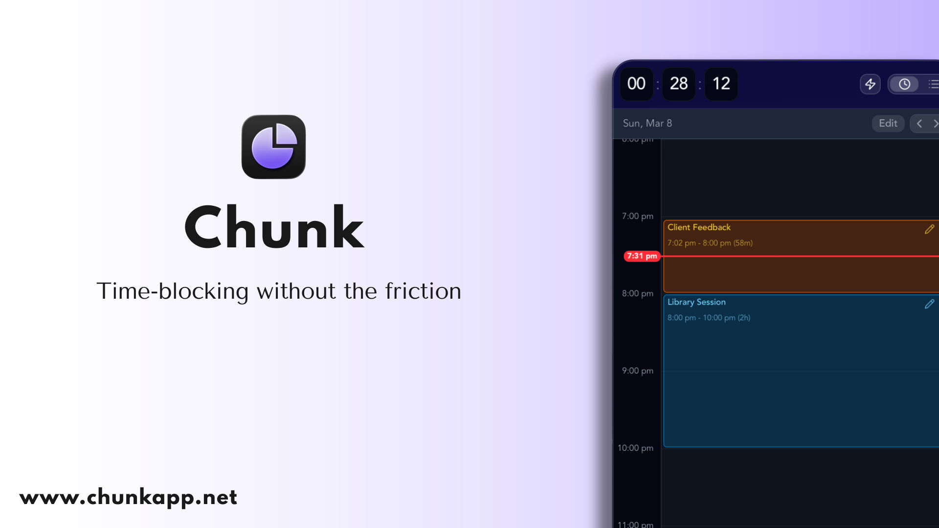 Chunk was built to fix exactly these friction points. Templates handle the repetitive planning. The menubar timer keeps you honest without being annoying. Instant tasks let you absorb interruptions without scrapping your whole day. And because it's a dedicated time block planner rather than a calendar you've repurposed, the whole interface is built around the workflow rather than bolted on top of something else. Time blocking only works if the tool makes it easy to keep going — not just easy to start.